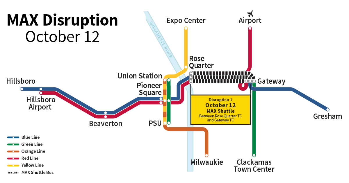 Domingo 12 de octubre: Las líneas MAX Blue, Green y Red se verán interrumpidas. Servicio de Colectivo dará servicio a Estación entre Rose Quarter Transit Center y Gateway/NE 99th Ave Transit Center.