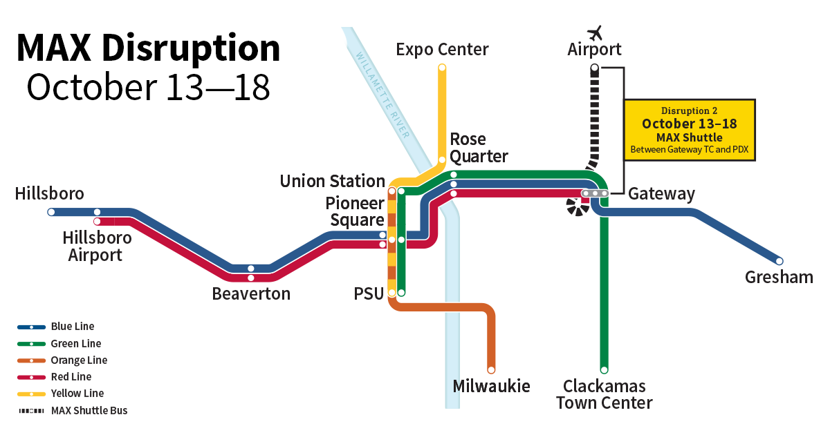 Del lunes 13 de octubre al sábado 18 de octubre: MAX servicio de línea roja se interrumpirá entre Gateway y Portland International Airport